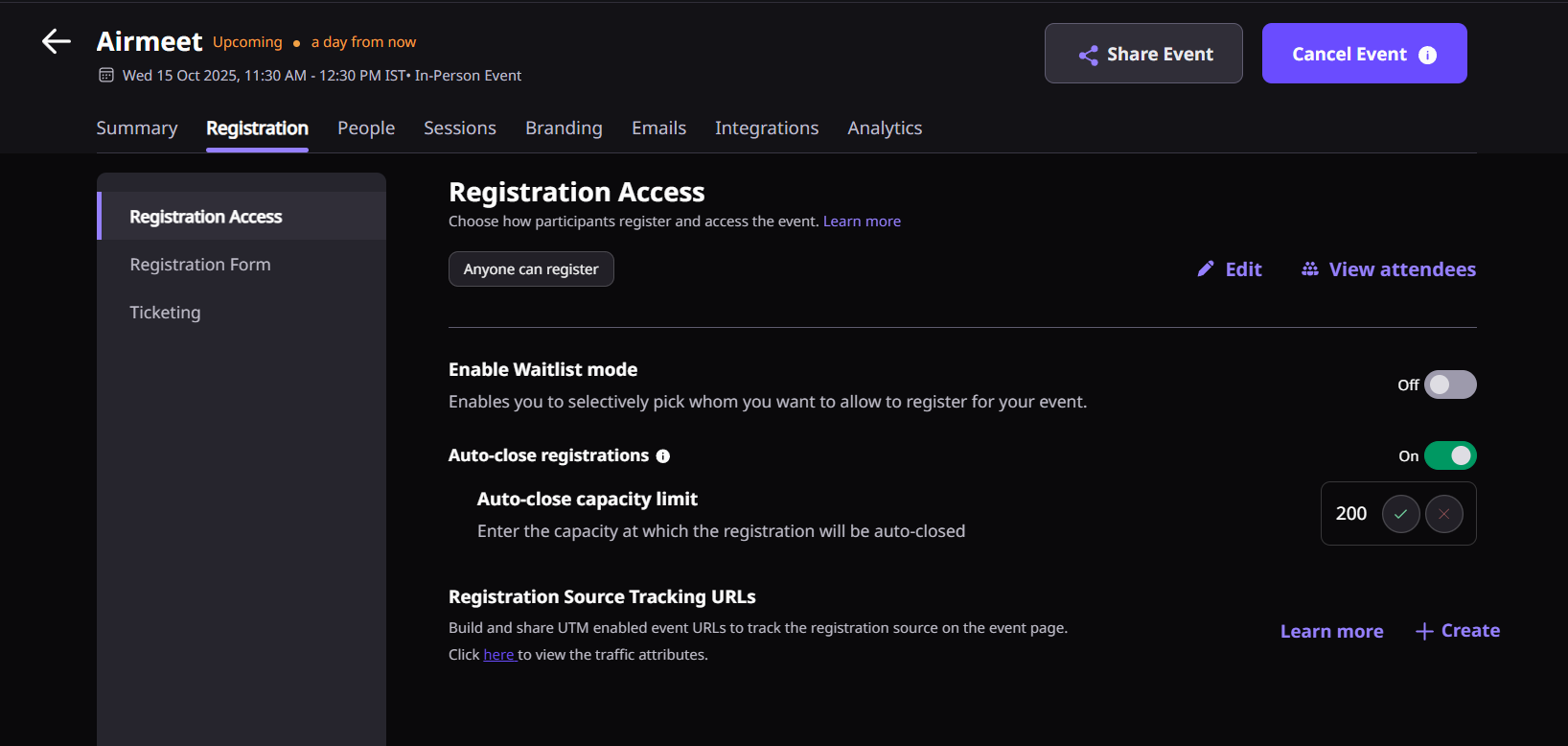 Take control of your in-person attendance. Organizers can now set a registration limit and choose when to close sign-ups to avoid overbooking.