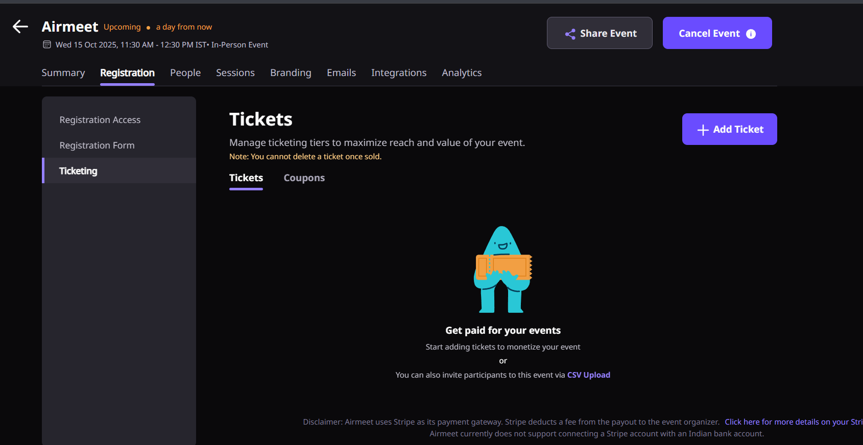 You can now manage registrations and ticketing for in-person events directly within Airmeet.