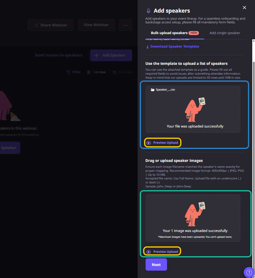 Simplify your event setup with the ability to bulk upload speaker details via CSV, including profile images.