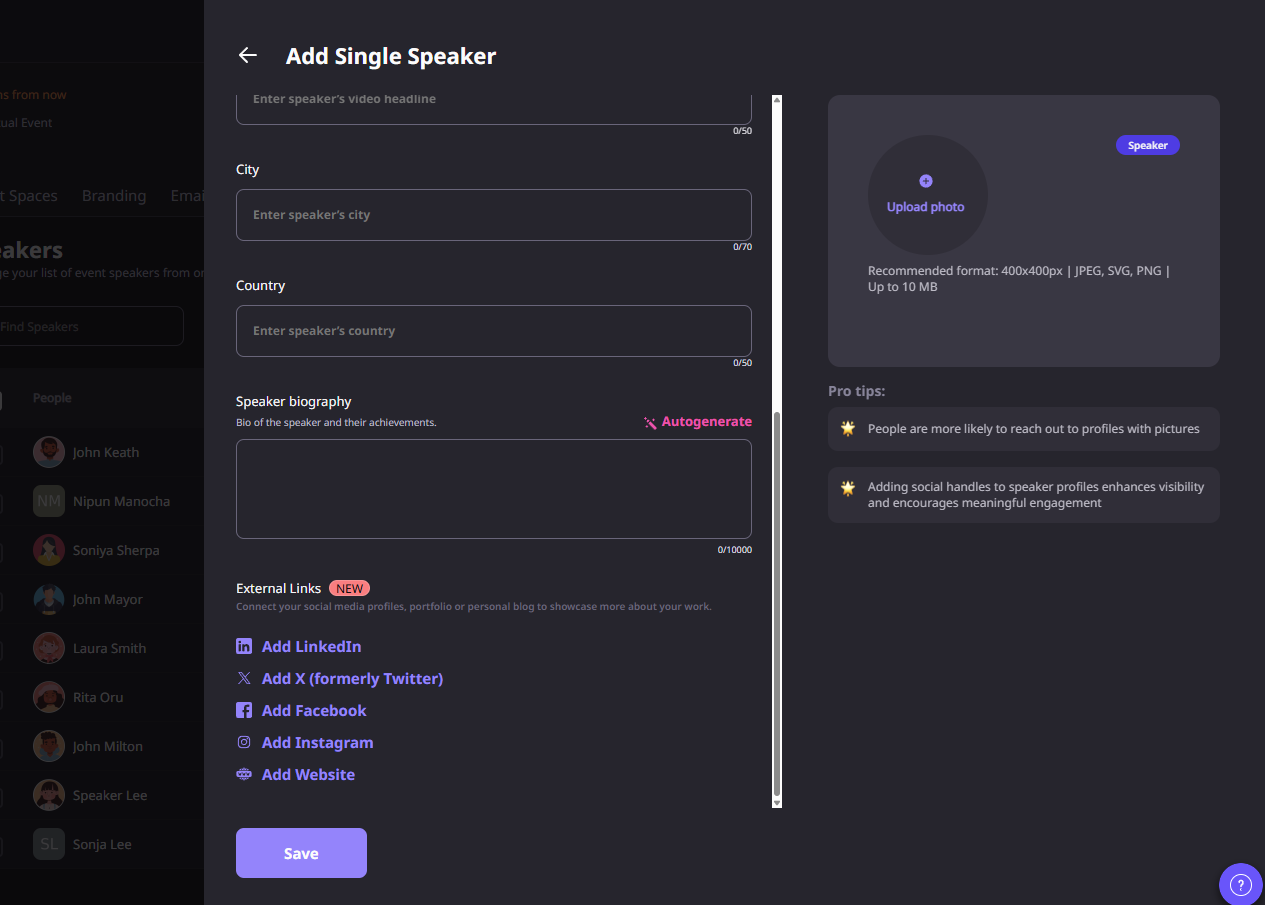 Empower your speakers and enhance networking by displaying their social media links on profiles.