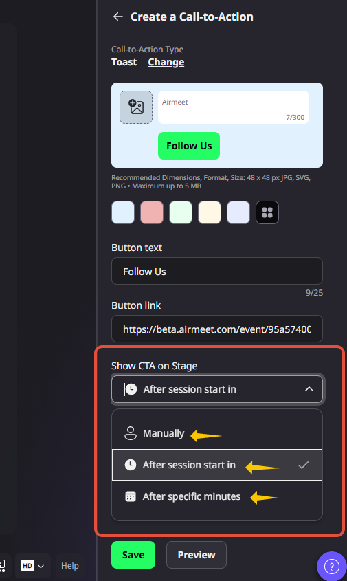 Set CTAs & banners to trigger after a specific time or manually, ensuring timely engagement without manual intervention and keeping attendees focused on key actions.