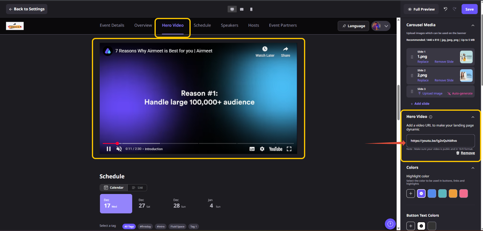 Now you can embed a video URL directly on your event landing page to feature promotional clips, welcome notes, or event highlights.
