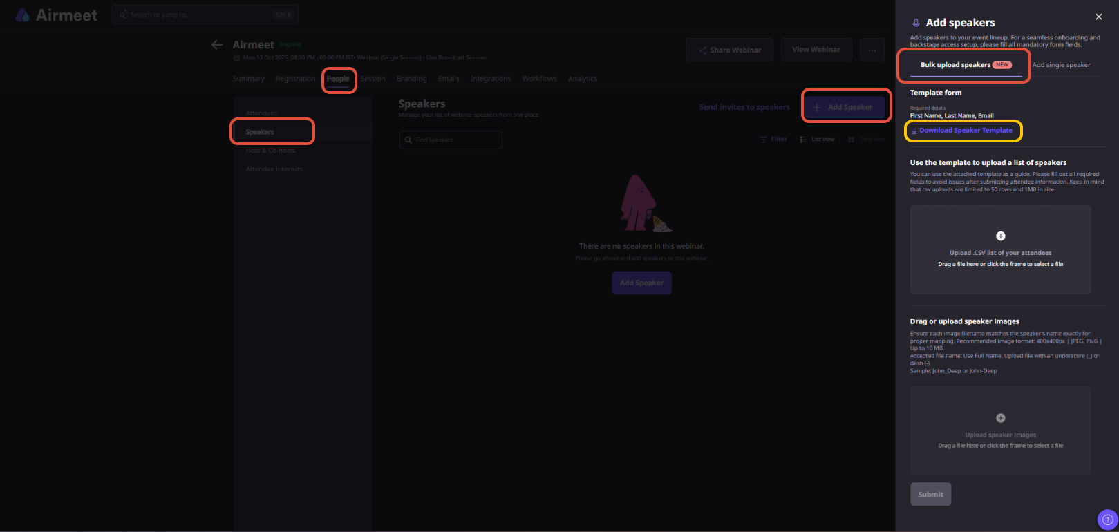Download the speaker template, fill in the details (First Name, Last Name, Email), and upload the completed CSV file.
