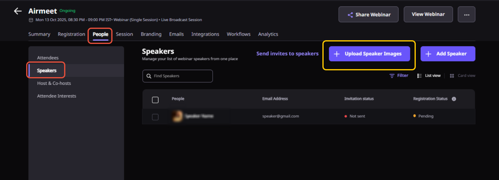 Your speakers will appear instantly in the Speakers list on the event dashboard.