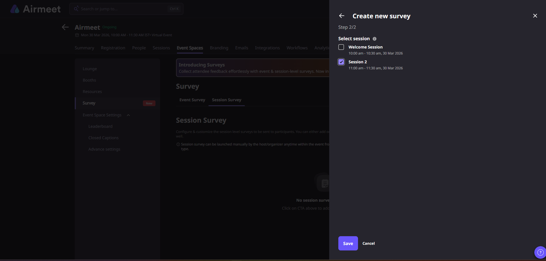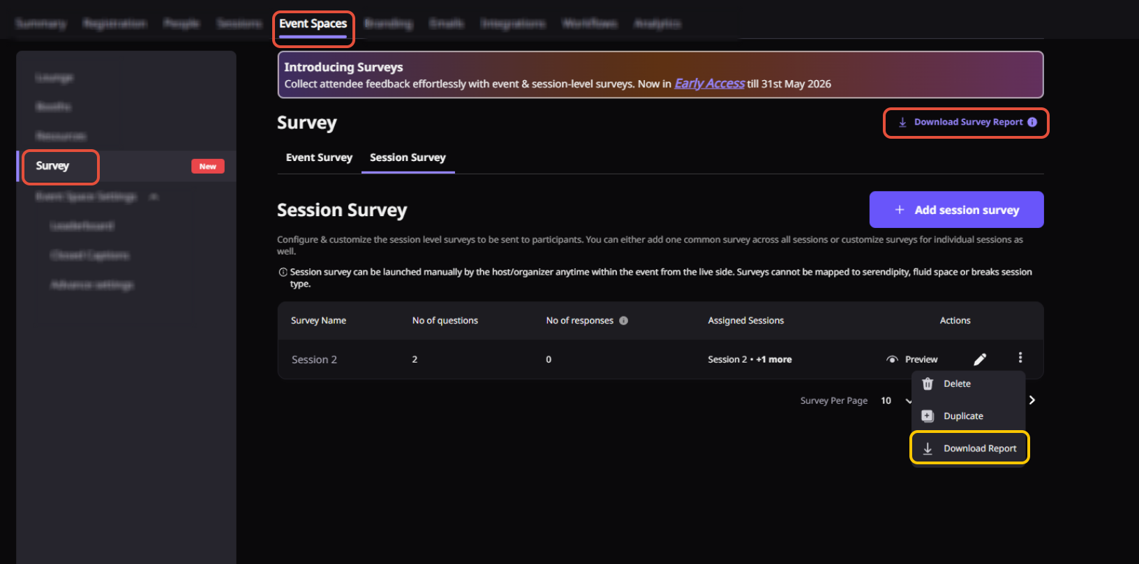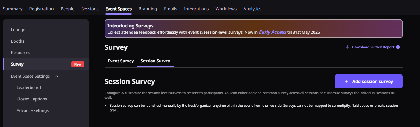 Step 1: Go to the Events Dashboard → Click on Event/Webinar Spaces → Navigate to the Survey tab → Select Session Survey.
