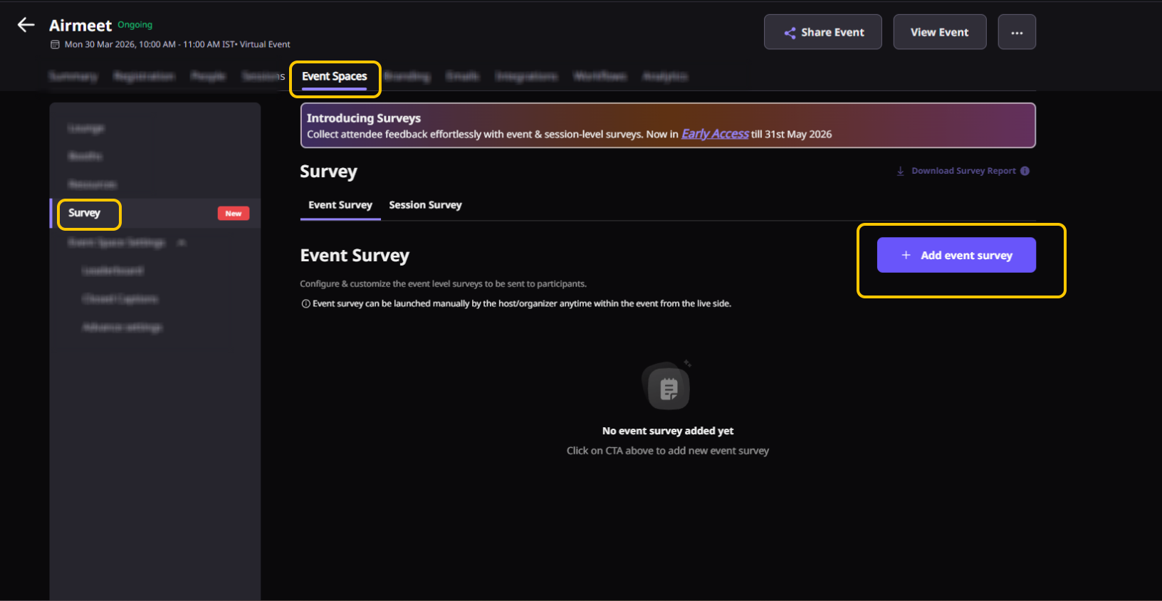 Step 1: Go to the Events Dashboard → Click on Event/Webinar Spaces → Navigate to the Survey tab on the left panel → Select Event Survey.