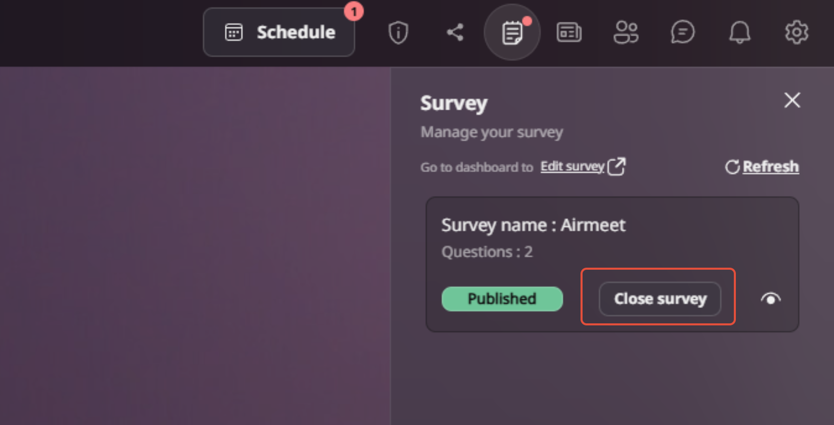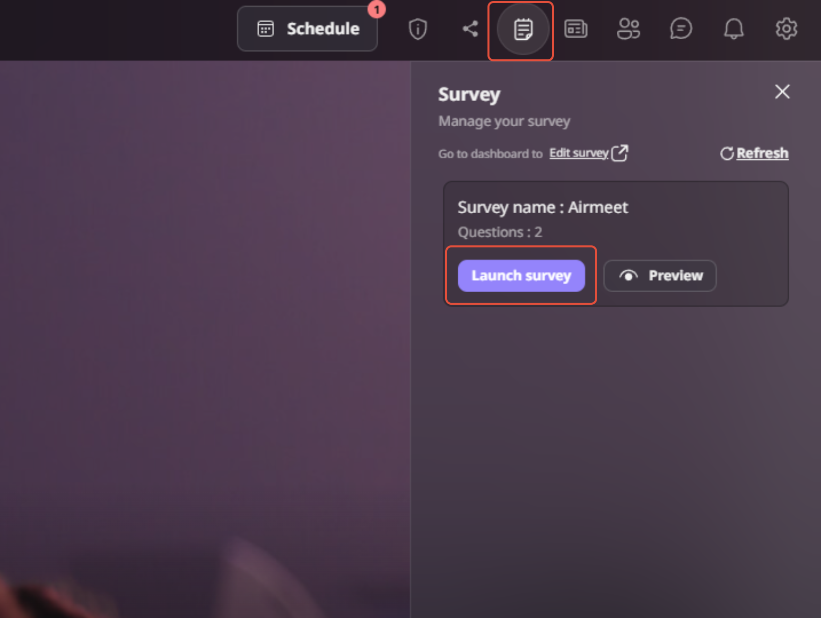 Step 1: Enter your event and locate the survey icon at the top-right corner.