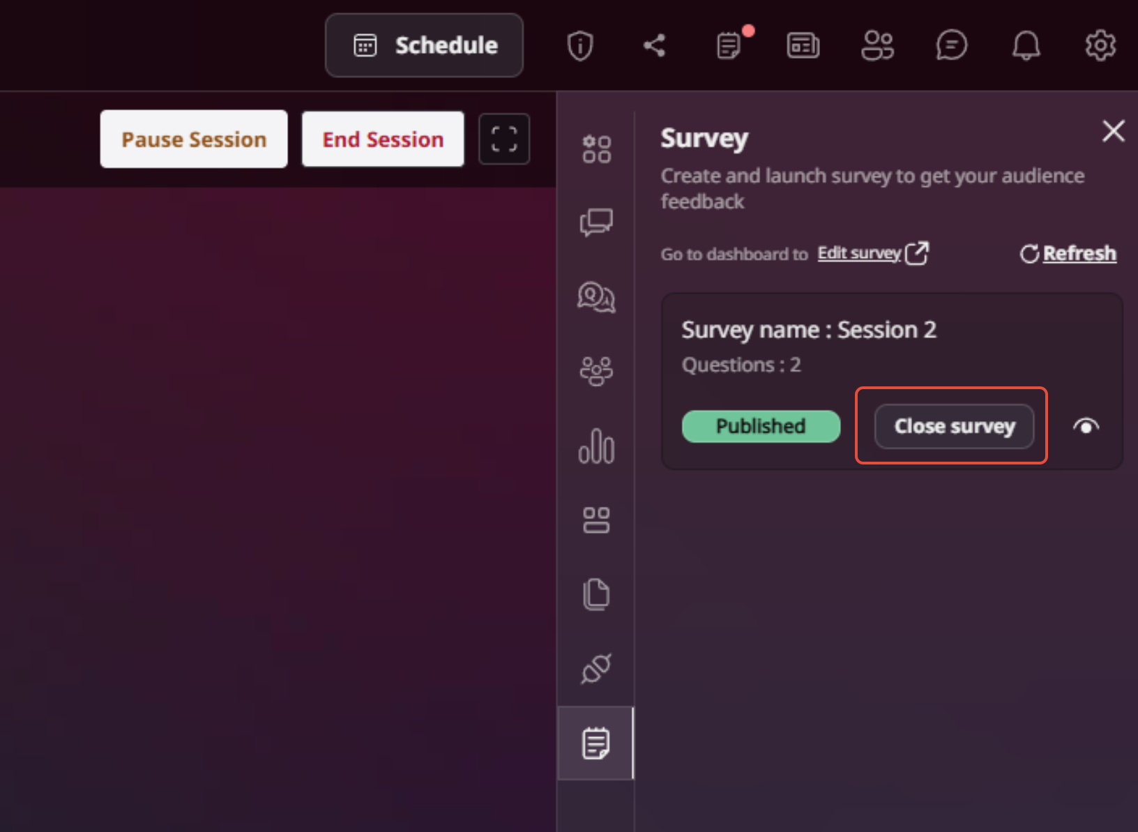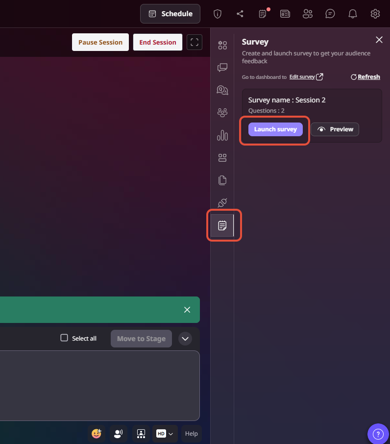 Step 1: Go to the session where the survey is mapped and locate the survey icon on the right-side panel of the stage.